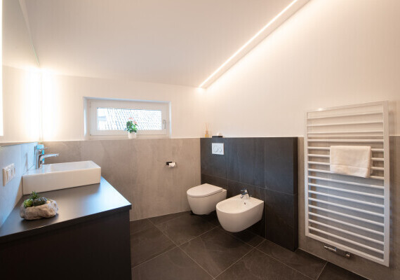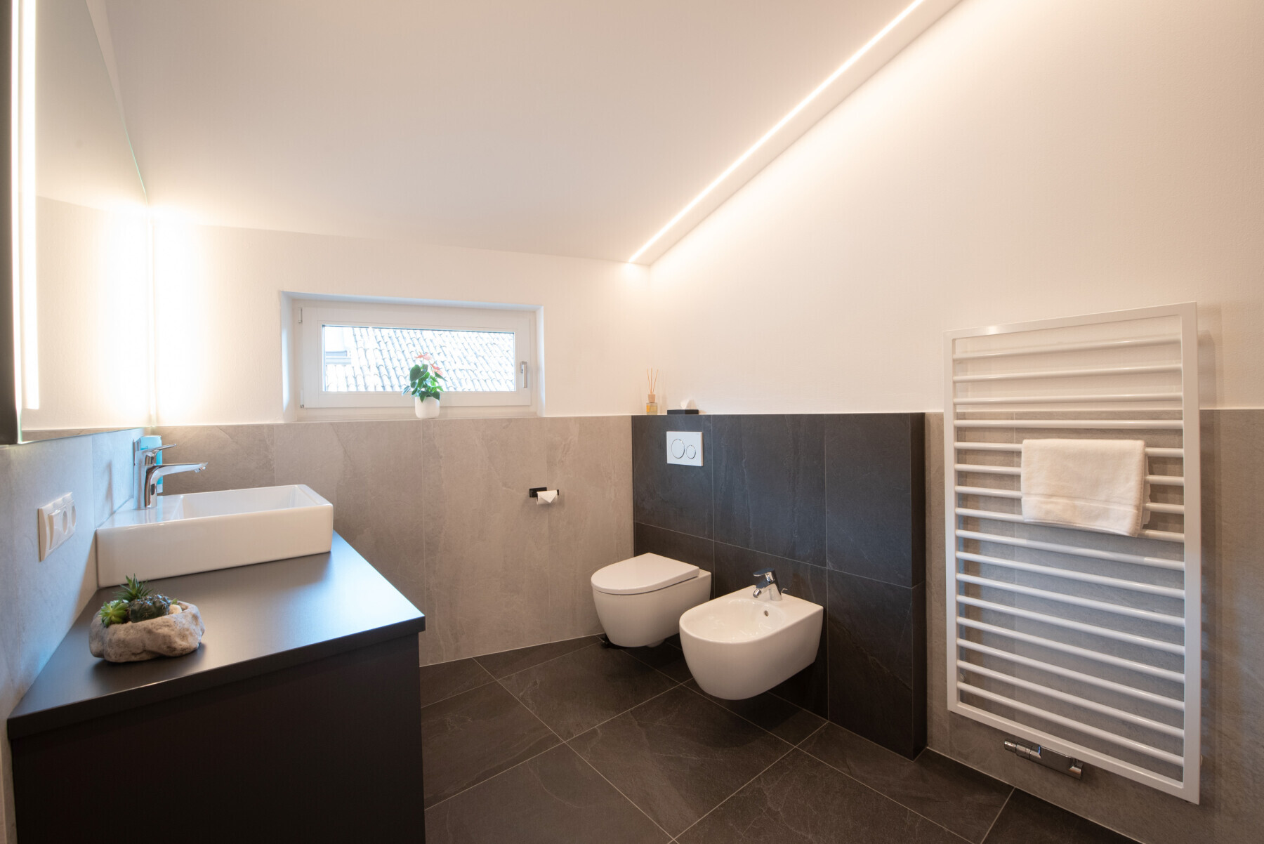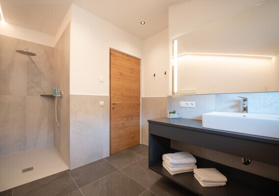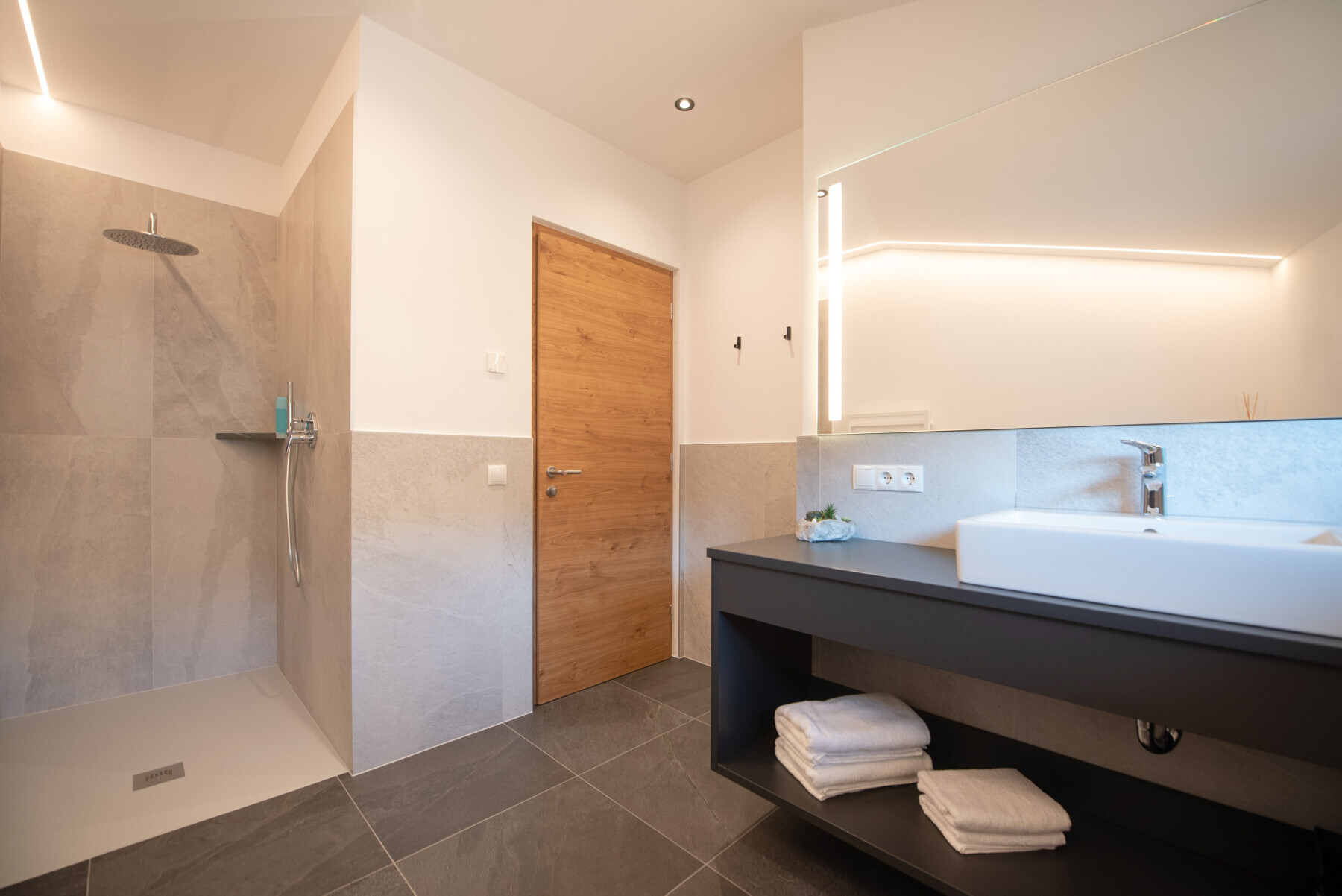 - Badezimmer mit großer Regendusche, WC, Bidet, Waschbecken, Föhn